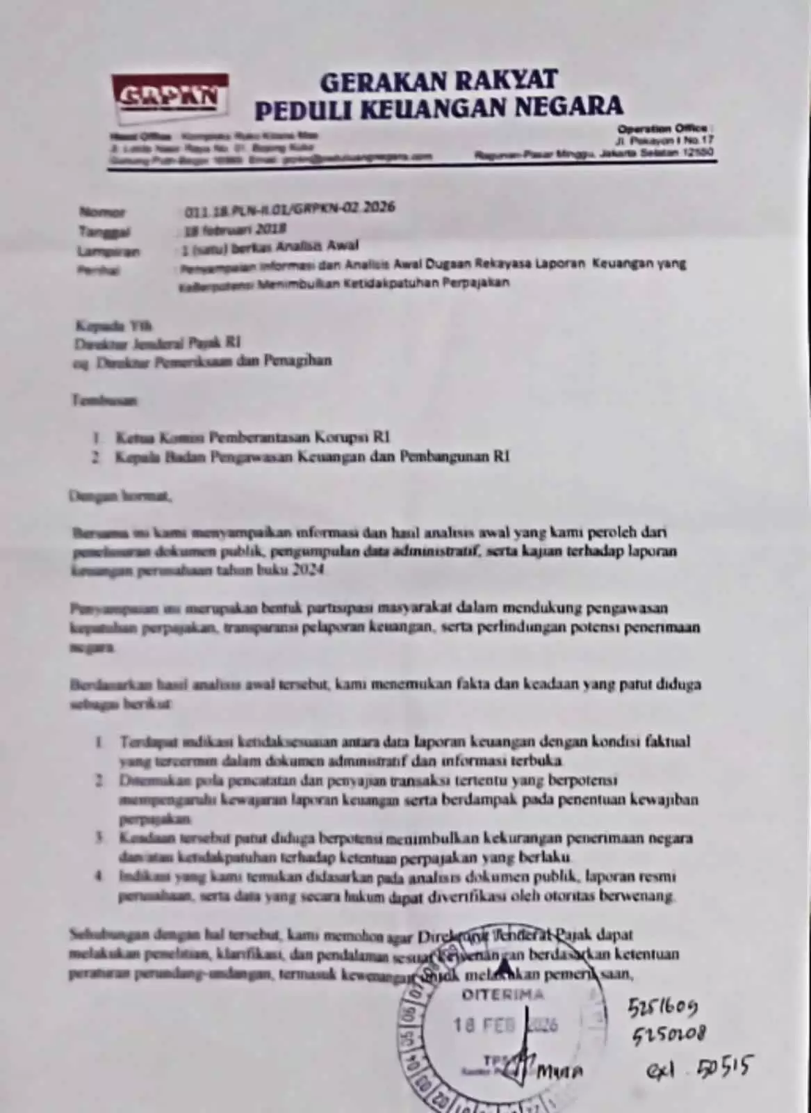 Jakarta, 18 Februari 2026 — Kelompok masyarakat sipil menyatakan telah menyampaikan laporan informasi awal kepada otoritas perpajakan terkait hasil penelusuran dokumen dan analisis administratif atas data keuangan PT PLN (Persero) untuk tahun buku 2021.